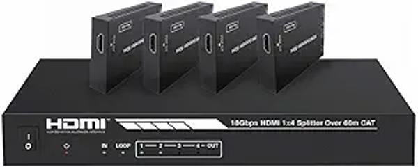 Monoprice 4K HDMI 2.0 1x4 Splitter Extender Kit - Up to 60 Meters 4K@60Hz, 18Gbps, HDR10, HDR10+, Dolby Vision, Hyper Log‑Gamma, HDCP 2.2, HDMI Loop Out, EDID, PoC, 4 Receivers - Blackbird Series